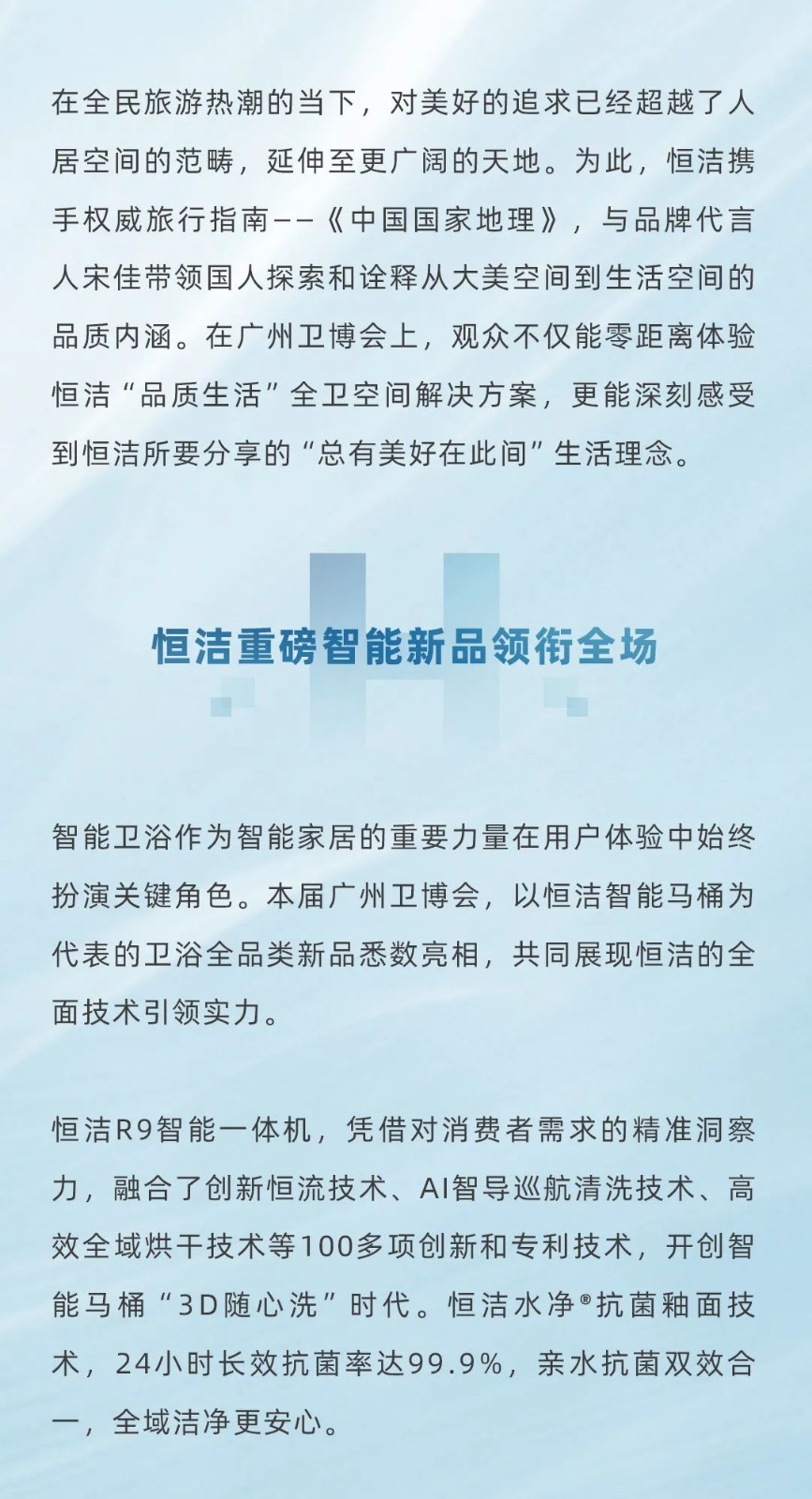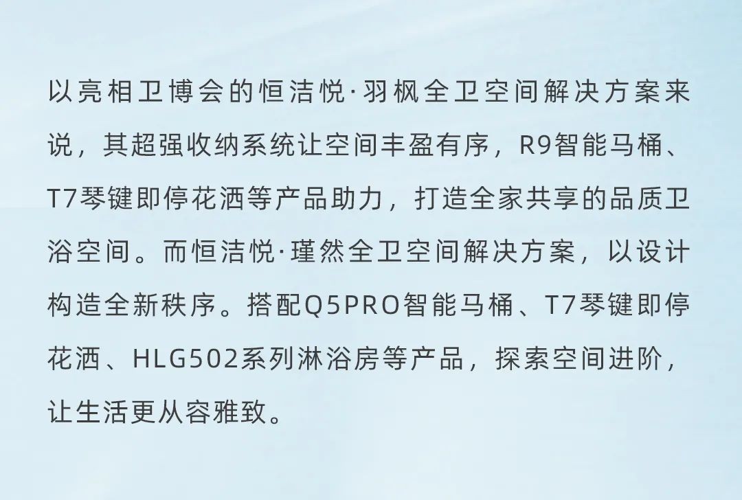 7月8日,2024广州国际卫浴博览会(以下简称广州卫博会)盛大开幕。作为全卫空间解决方案提供者恒洁携最新研发的产品系列与前沿技术惊艳亮相,不仅展示了品牌在卫浴领域的深厚底蕴,更以独特的设计理念和智能化的技术应用,向观众传递了“总有美好在此间”的理念。