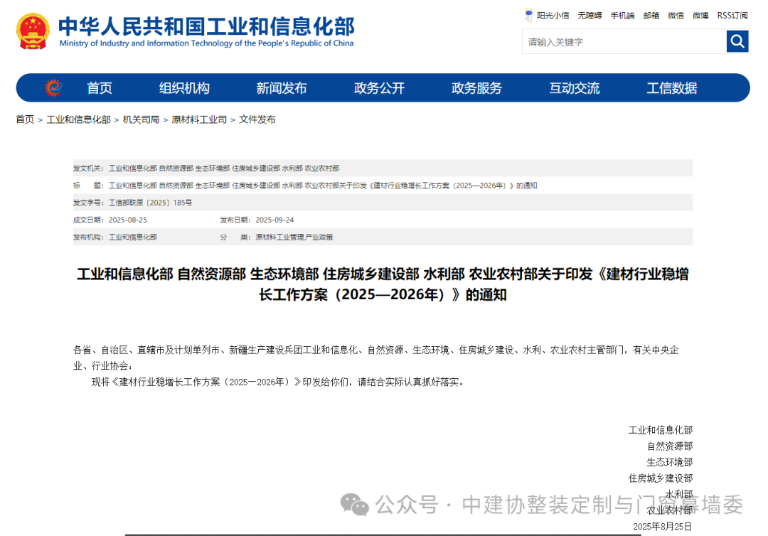 9月24日,工业和信息化部、自然资源部、生态环境部、住房城乡建设部、水利部、农业农村部联合印发《建材行业稳增长工作方案(2025—2026年)》(以下简称《方案》)。