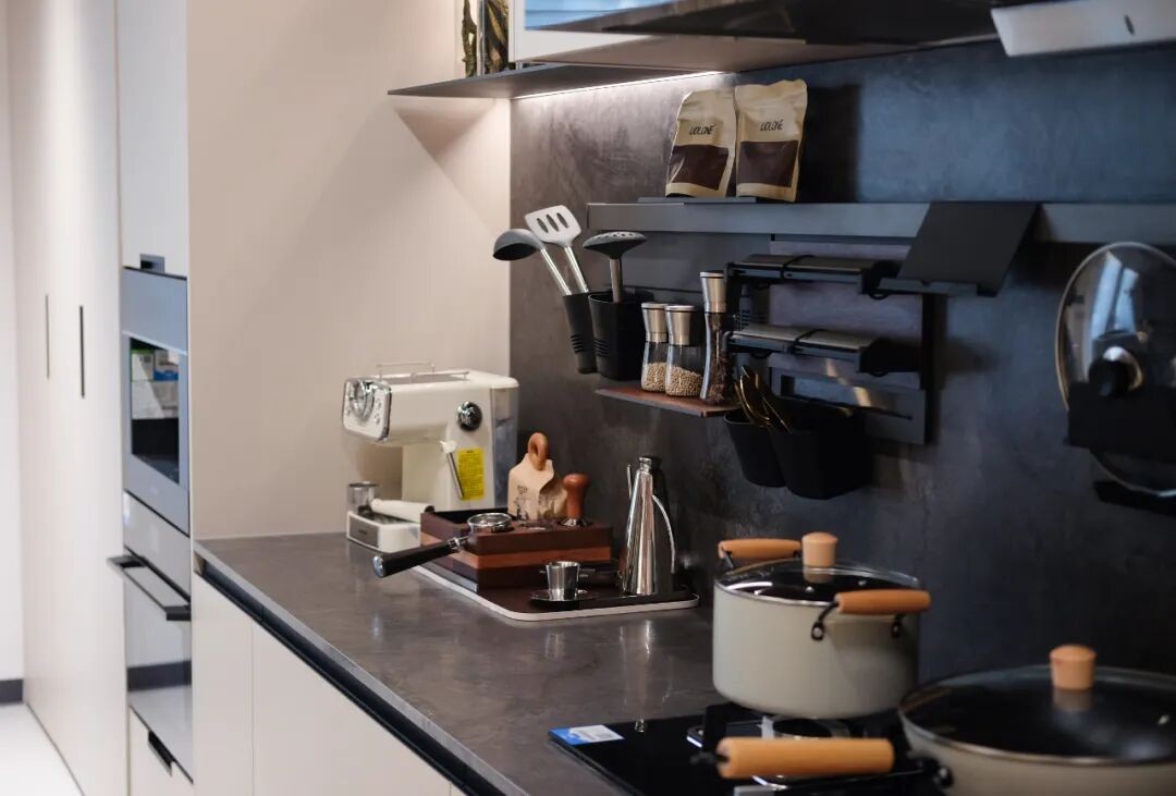 人性化的细节设计与智能科技的深度融入,是柏菲伦塑造高品质生活的核心密码。玄关区的垂直收纳系统集成了鞋架与次净衣消毒仓,高效解决小户型入户收纳痛点;吊柜升降机、高柜联动篮让高处取物“抬手即达”,嵌入式冰箱、水槽洗碗机则构建了“零弯腰”的流畅动线。