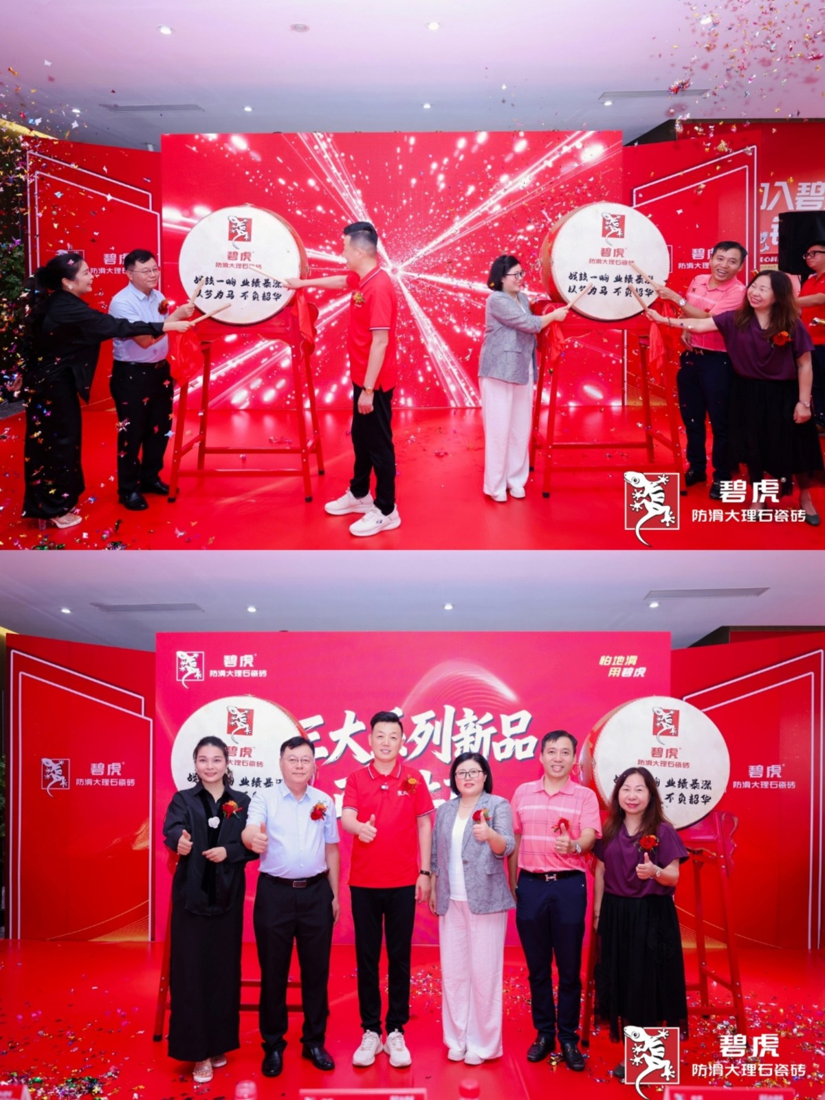 发布会进入高潮,一场极具仪式感与力量感的击鼓启动仪式揭开碧虎三大新品面纱。随着全场共同倒数“5、4、3、2、1”,鼓声震彻会场,既是碧虎新品启航的号角,更奏响陶瓷行业功能化创新的强音。克隆原石2.0天润石、超易洁金丝绒、民宿艺术花砖三款新品精准契合“安全+美学+实用”需求,正式入市为行业产品创新注入新活力。