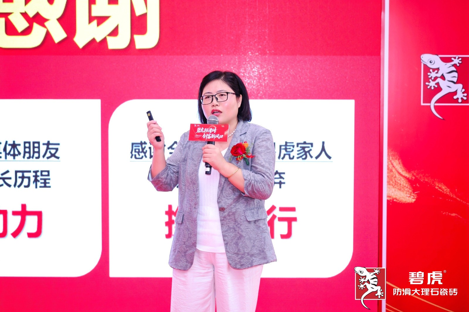 碧虎总经理高玉秀则聚焦“终端创富”,分享实战方法论。她提出“终端不是卖产品的地方,是攒口碑、聚人心的地方”。碧虎防滑大理石瓷砖以“中国瓷砖防滑王”的行业领军者姿态,通过科技创新与立体营销双轮驱动,开创陶瓷行业功能化新赛道。品牌凭借国家认证的国际先进防滑技术(静摩擦系数>0.7)和“防滑=碧虎”的消费者心智占位,构建起覆盖全国900+经销商的网络体系,其360°立体营销帮扶系统更以19.8万元价值赋能合作伙伴,从门店动销、线上引流到区域招商实现全周期闭环管理。