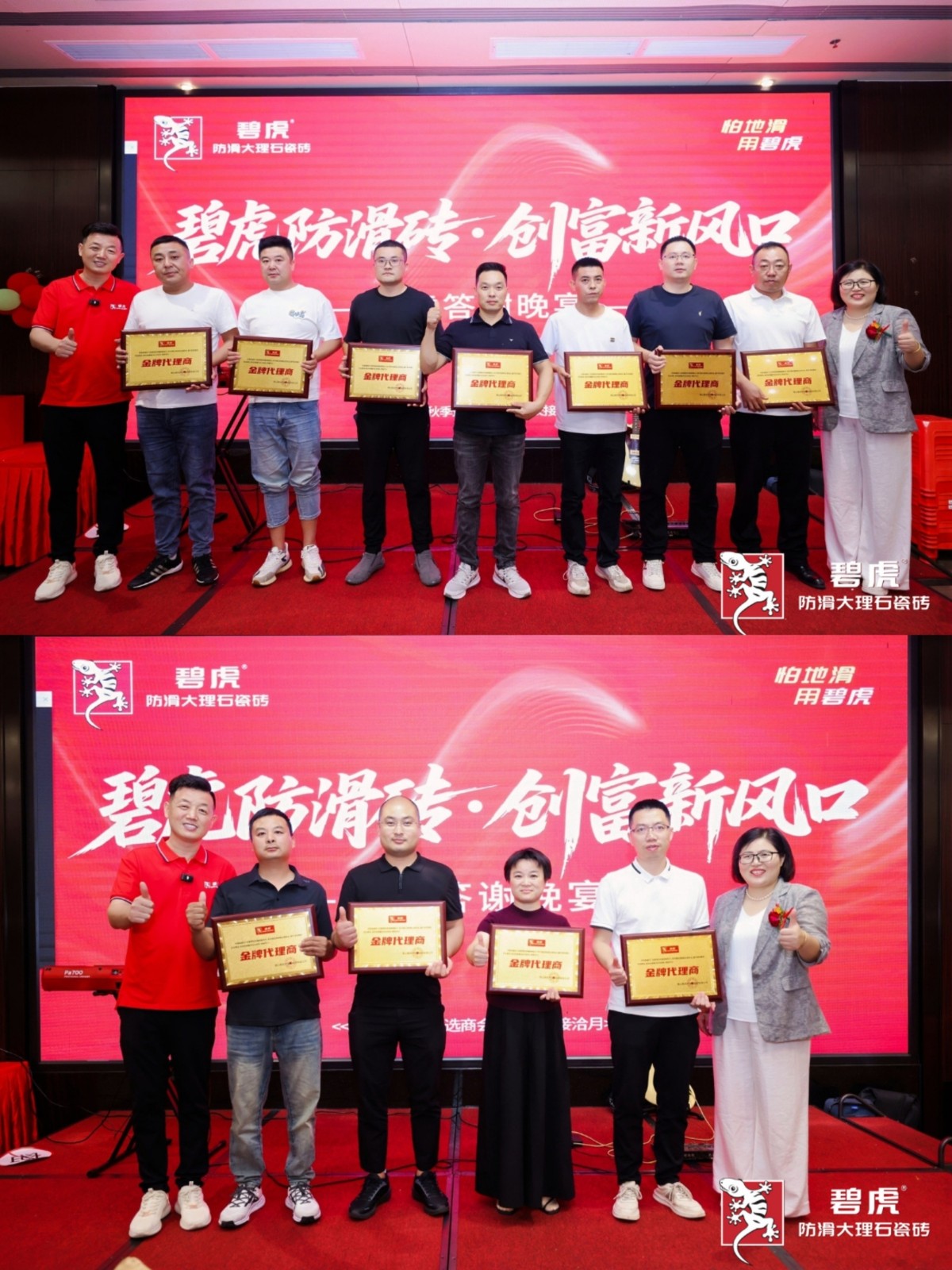 从战略复盘、新品启动、签约合影,到荣誉授牌、温情交流,碧虎2025年度战略总结暨新品发布会构建了一幅“技术为核、产品为翼、终端为基、厂商共赢”的完整图景。这场盛会不仅是碧虎品牌实力的集中展示,更成为陶瓷行业功能化转型的重要缩影——碧虎以“怕地滑,用碧虎”的清晰定位,将防滑技术从“功能属性”升级为“安全承诺”,以三大新品打破“功能与美学割裂”的行业痛点,以百人签约与千万大商案例证明创富模式的可行性。