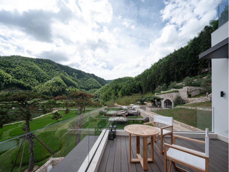 而阳台,则似是通往云海的船甲板,草木葱茏的院子中,藤椅小桌在等着宾客们的到来。