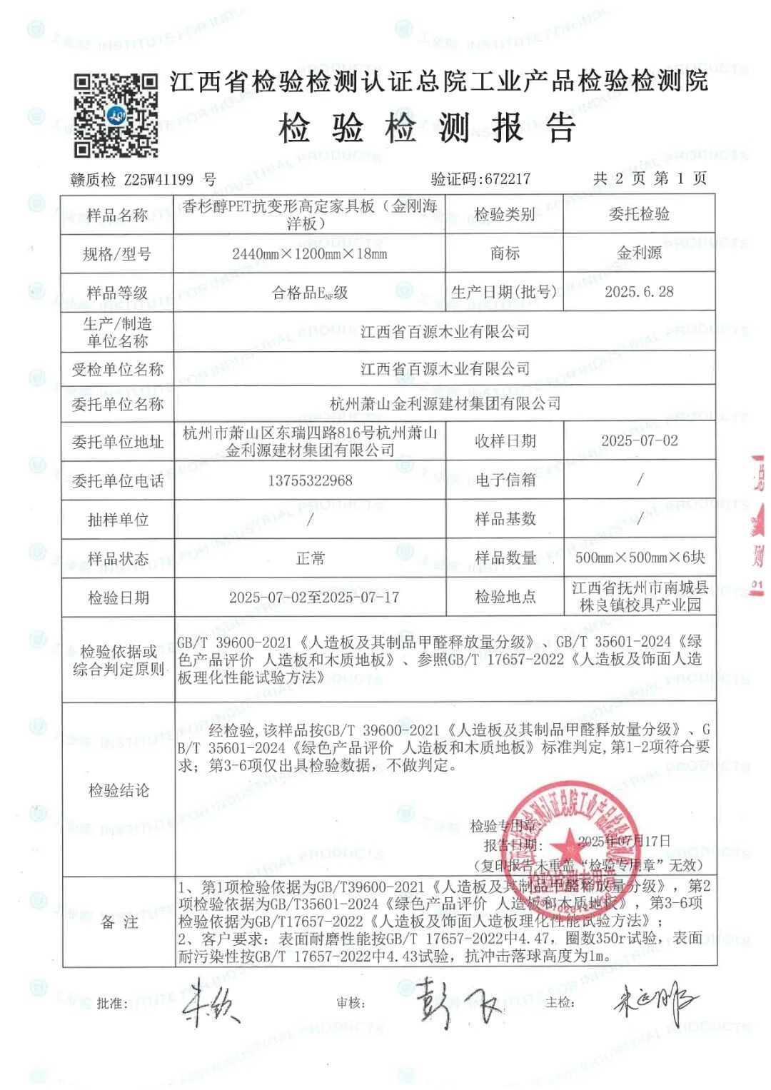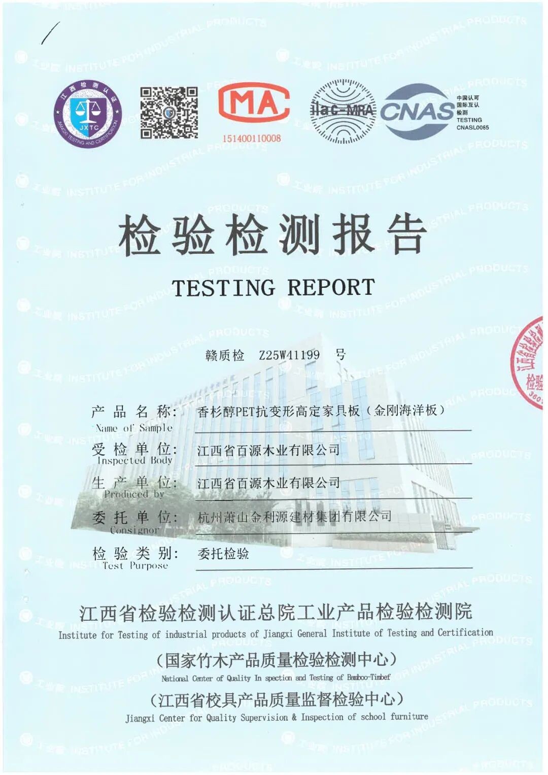 金利源PET高定板在严苛的耐黄变检测中表现卓越,外观无起泡、无剥痕、无裂纹、粉化0级,变色0级。