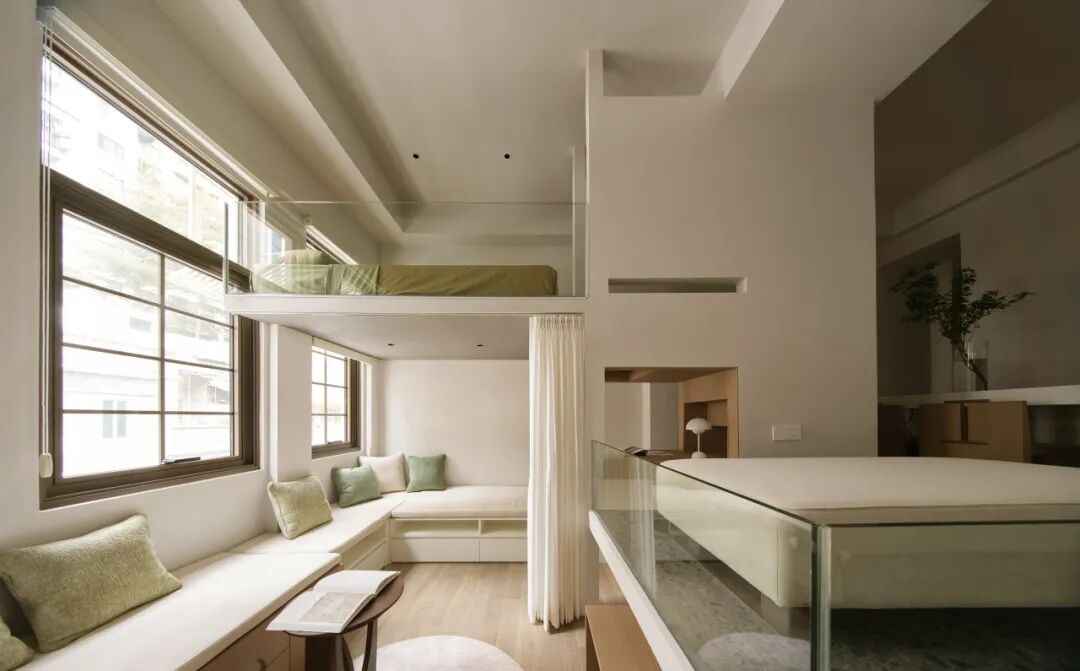 在本次改造中9个房间,谢英凯老师并非采用统一标准化的布局,而是设计了一系列适应不同年龄层的户型,更还利用骑楼层高的优势,在二楼两个复式户型采取错层设计。