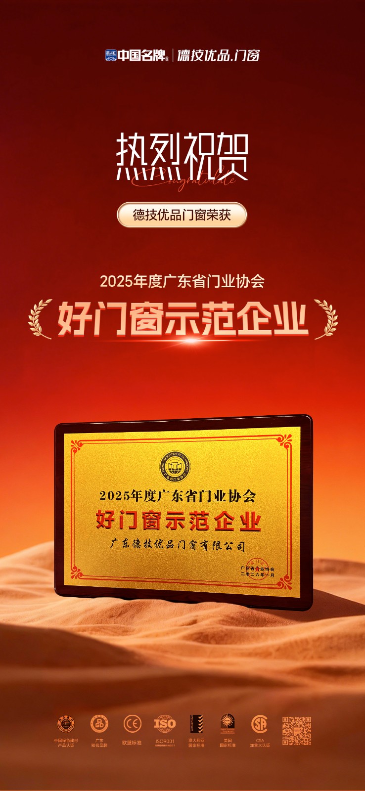 盛会现场,荣耀揭晓!凭借在安全系统门窗领域的深耕积淀、卓越的产品品质与引领行业的创新实力,德技优品门窗成功斩获“2025年度广东省门业协会好门窗示范企业”殊荣!这一荣誉不仅是广东省门业协会对德技优品品牌实力的高度认可,更是行业与市场对我们坚守品质、践行初心的最佳见证。