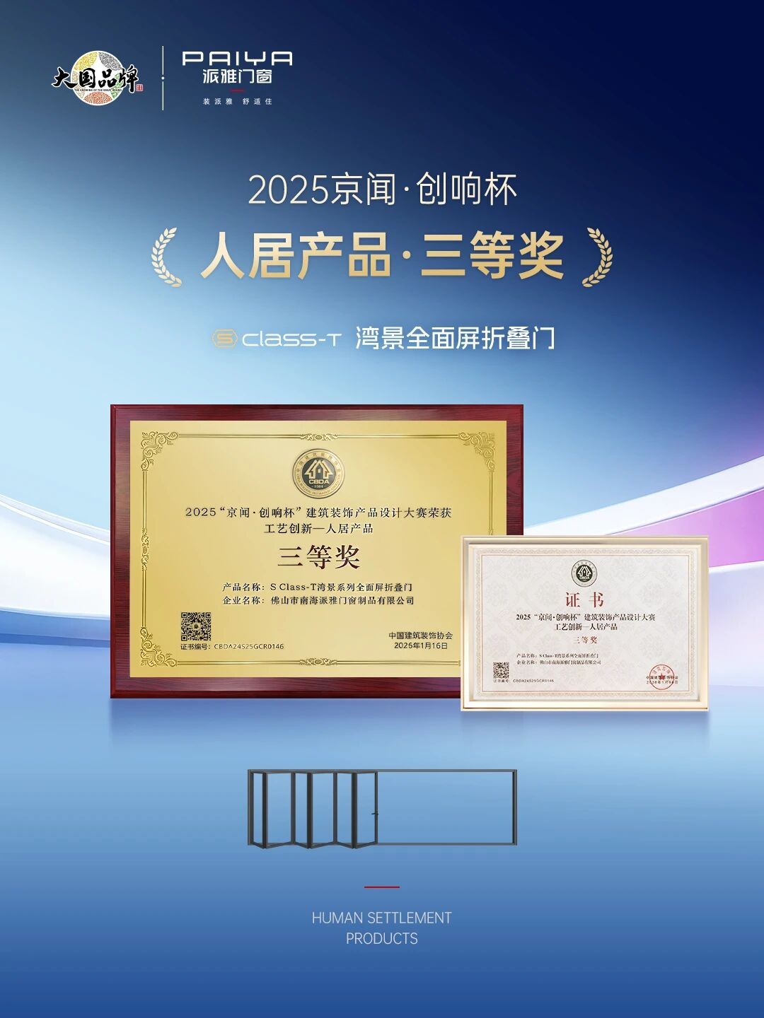 作为此次的获奖产品,SClass-T湾景全面屏折叠门以创新全面屏美学设计及硬核的隔音、隔热、安全性能,从众多参赛作品中脱颖而出。至今,派雅已连续两年斩获"京闻·创响杯"产品奖项,这份荣誉不仅是行业对派雅门窗持续创新能力的高度认可,更是派雅深耕行业多年,始终坚守“建筑科技,以人为本”核心理念的有力见证。